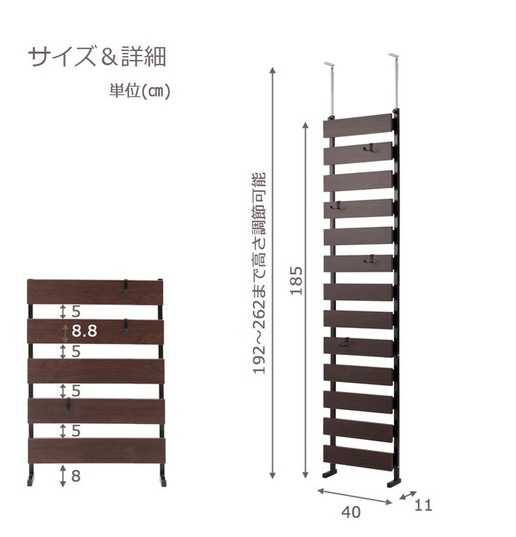 ■商品サイズ/本体:(約)幅40×奥行9(脚部11)×高さ192~262cm、ラダー間隔:(約)ラダー高さ8.8・すきま5cm、目隠し部高さ:(約)185cm