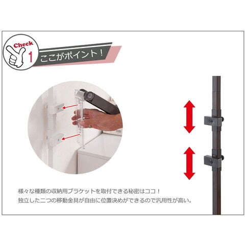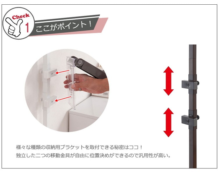 独立式無段階可動アタッチメントが2つと、パーツストックに便利な上下可動4連フックが1つ、そして最上段の不動フックが1つの構成で様々な収納アレンジができます。