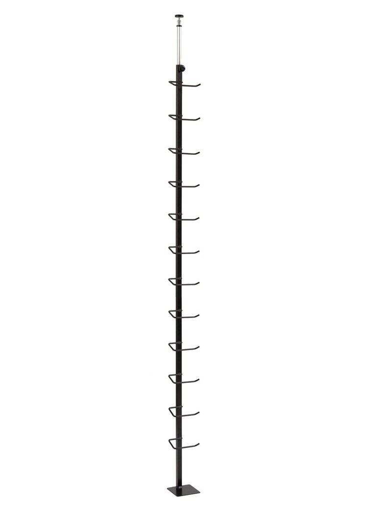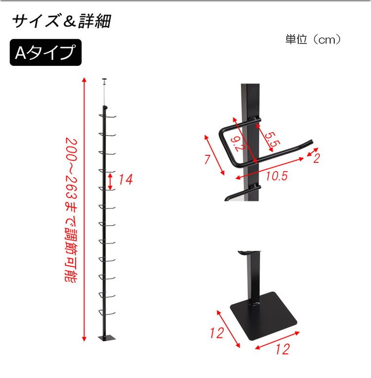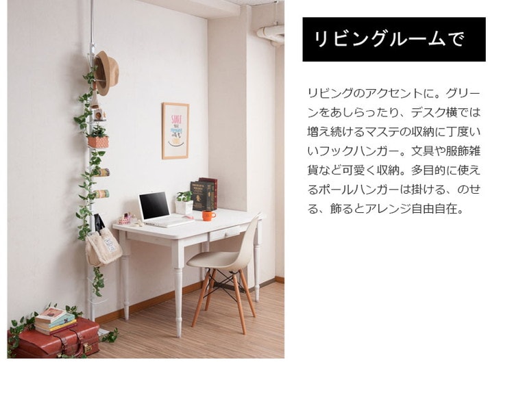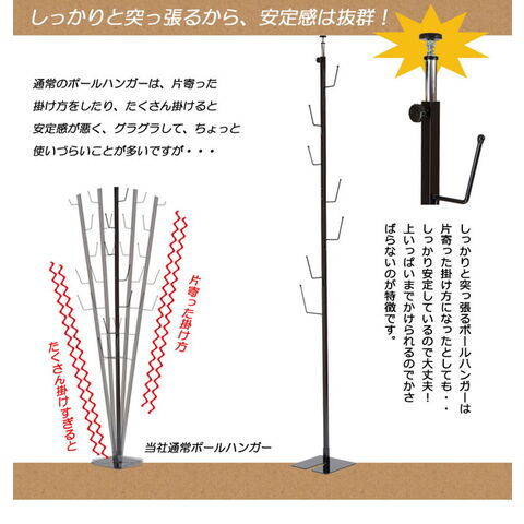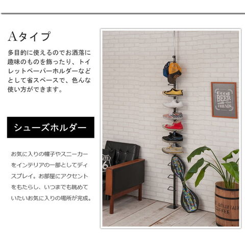 らせん状にフックを散らしているのでキャップやTシャツ、ジーンズを適当に掛けてもカッコいい。A・Bタイプとも突っ張り式で安定性があるから安価なウッドハンガーより長く使えるのもいい。
