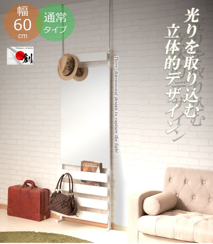 日本製 突っ張り 立体ラック 収納ラック ミラーラック 幅60cm 通常タイプ ホワイト リビング リビングおしゃれ シンプル【送料無料】
