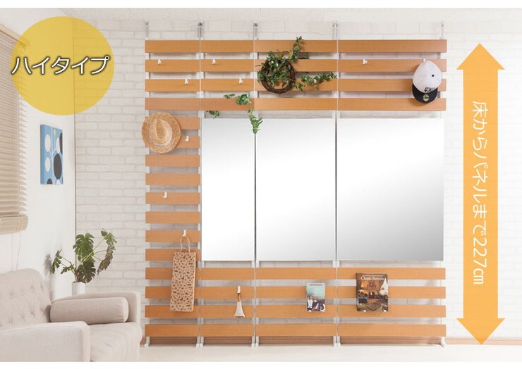 ミラータイプを壁面いっぱいに並べればリゾートホテルのような感覚に。玄関やリビング、キッチンなどあらゆるシーンに。