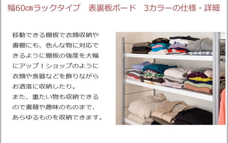 棚板厚のボリュームアップにより強度も備えた収納面に間仕切り面はすっきりとした木目調から清潔感あるホワイト色の3カラー展開。