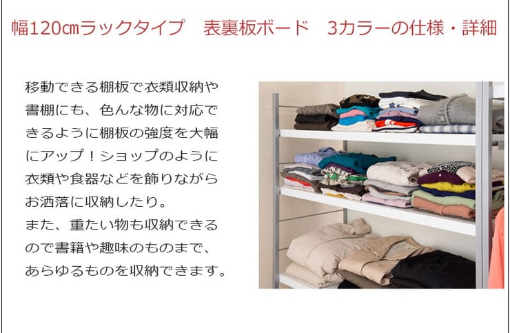 棚板厚のボリュームアップにより強度も備えた収納面に間仕切り面はすっきりとした木目調から清潔感あるホワイト色の3カラー展開。