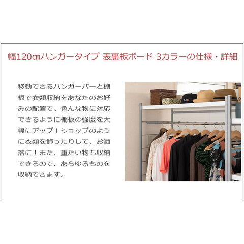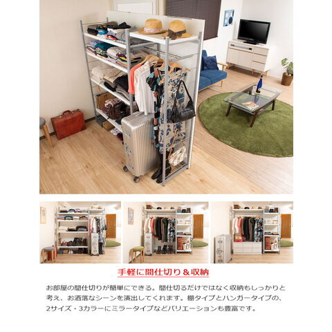 収納面はハンガーラックと4段棚の2タイプに、間仕切り面はボードと全身ミラーの2タイプをご用意。
