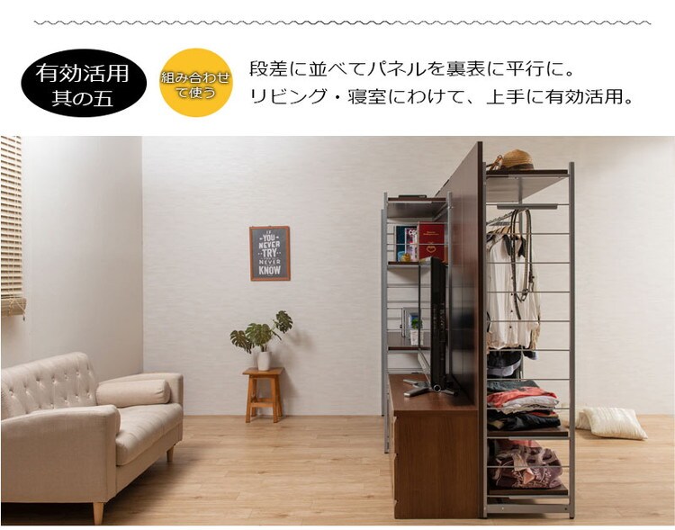 収納面はハンガーラックと4段棚の2タイプに、間仕切り面はボードと全身ミラーの2タイプをご用意。オフィスでの使用はもちろん、ご家庭でも間仕切りプラス収納で使い勝手のよいパーテーションです。