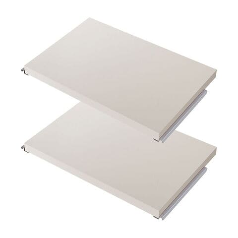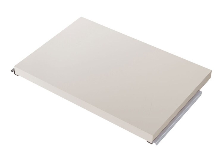 頑丈設計の間仕切りラックシリーズの専用棚板パーツ。棚板厚のボリュームアップにより強度も備えた収納面に間仕切り面はすっきりとした木目調から清潔感あるホワイト色の3カラー展開。