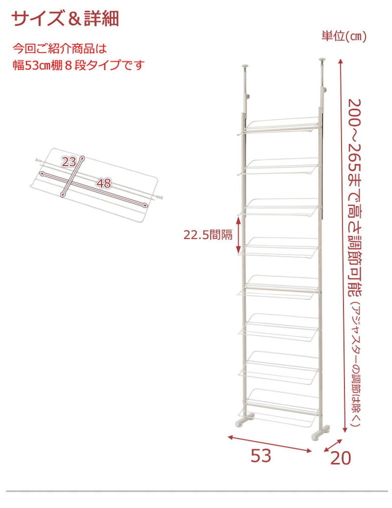 ■商品サイズ/本体:(約)幅53×奥行22.5×高さ200~265cm、脚部アジャスター調節範囲/(約)1cm、棚間隔/(約)23cm