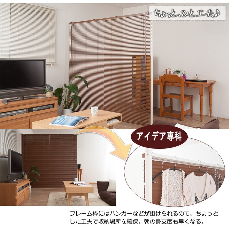 ブラインドとして使うだけでなく、裏側にハンガーを掛けて翌日の洋服を掛けたりと、少しの工夫で空間をより快適に。