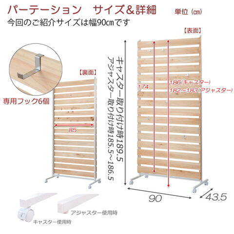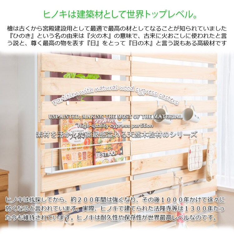 更に付属のフックで機能も充実。別売りマガジンパーツでさらに収納力が広がります。デザイン・機能・ディスプレイと3拍子揃った、ひのきキャスター付き間仕切りパーテーションを是非体感してください。