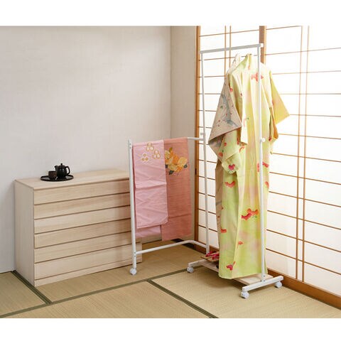 ■商品について/着物のハンガーと呼ばれる衣桁【IKOU】シリーズ。お洒落なキャスター付きの衣桁として新登場!!カラーは2色から選べます。洋室でも合う、シンプルで明るいホワイトフレーム×白木桐板、和の雰囲気はもちろん洋室でも合うブラックフレーム×ブラウン桐板の2カラー。桐生地仕上げの棚板とホワイトのフレームで明るい色系の着物などが映え、ブラックカラーはアジアンテイストにも合うデザインで様々なお部屋に合います。伸縮機能のハンガーは高さを低くして子供の成長から使え便利。通常の衣桁は使う時は広げて使い、閉じている時には使えませんが、この衣桁は閉じている時も使えて、しかもキャスターで移動が簡単です。使う時にサッと出して広げる、閉じて隙間にサッと直す。使いやすくて大変便利な衣桁です。