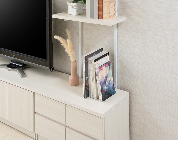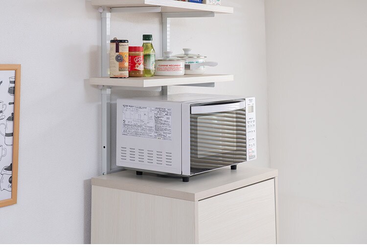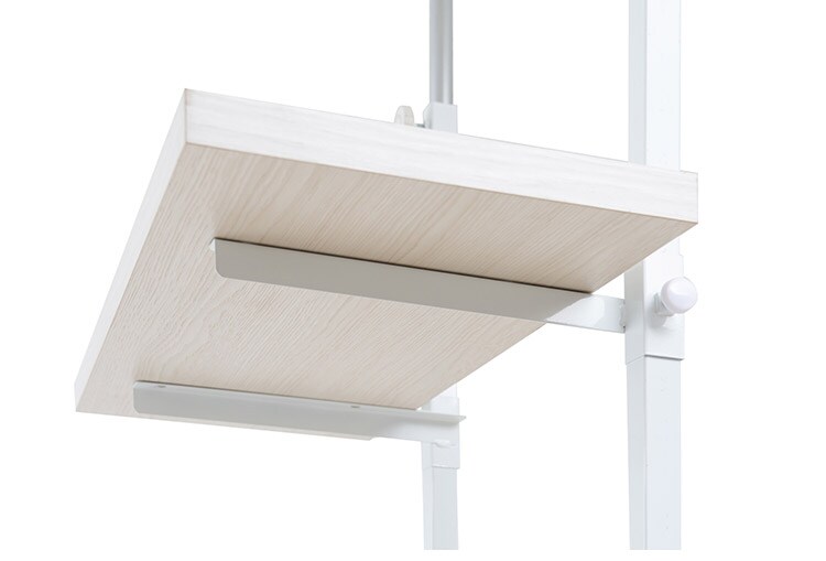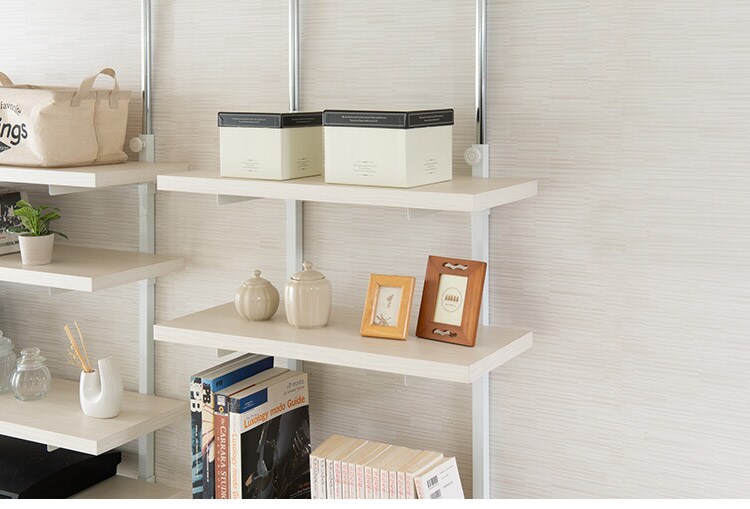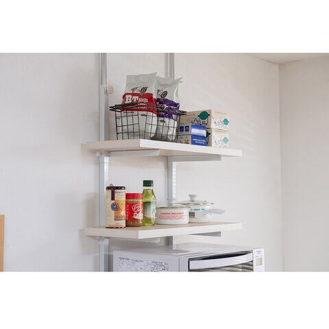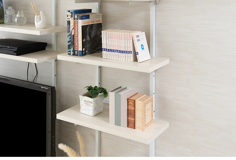 無段階に棚板の位置を調節できる突っ張りウォールシェルフ。棚板の位置を無段階に調節できるから自分の丁度いい高さにすることができます。