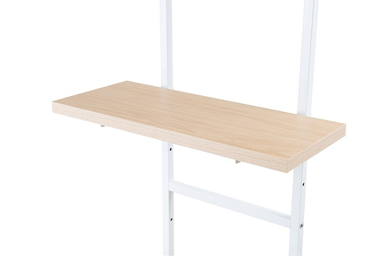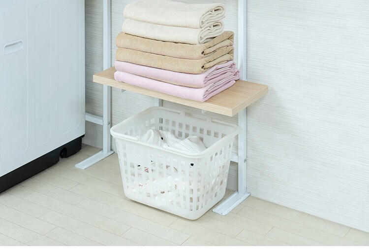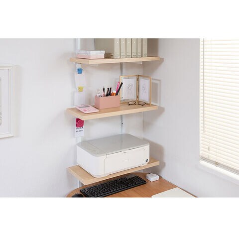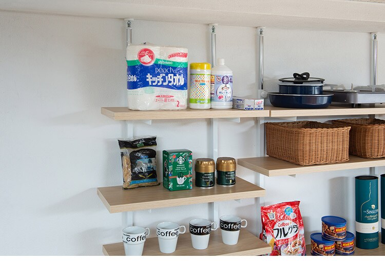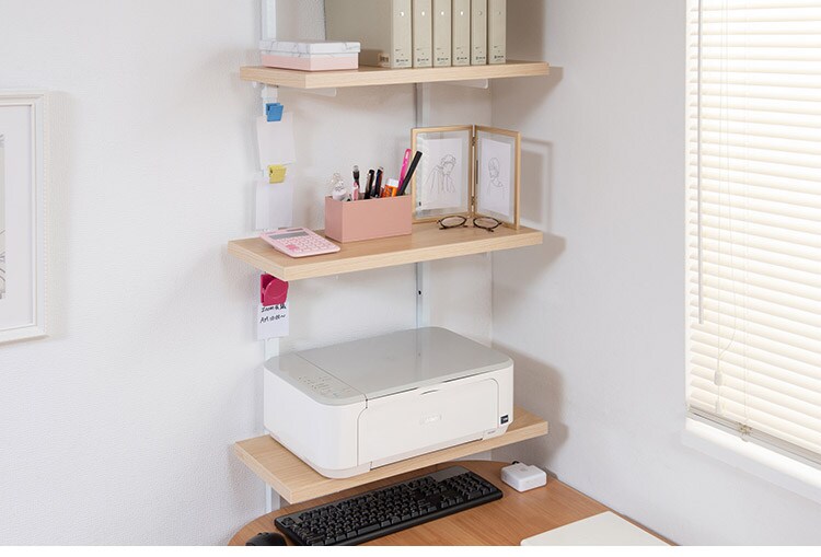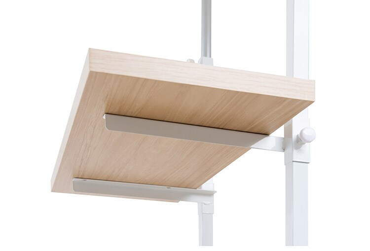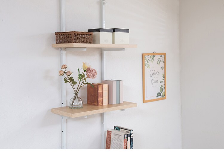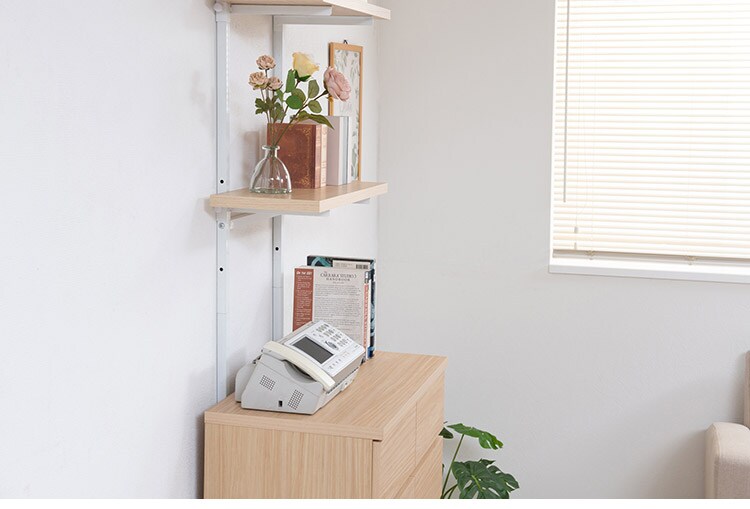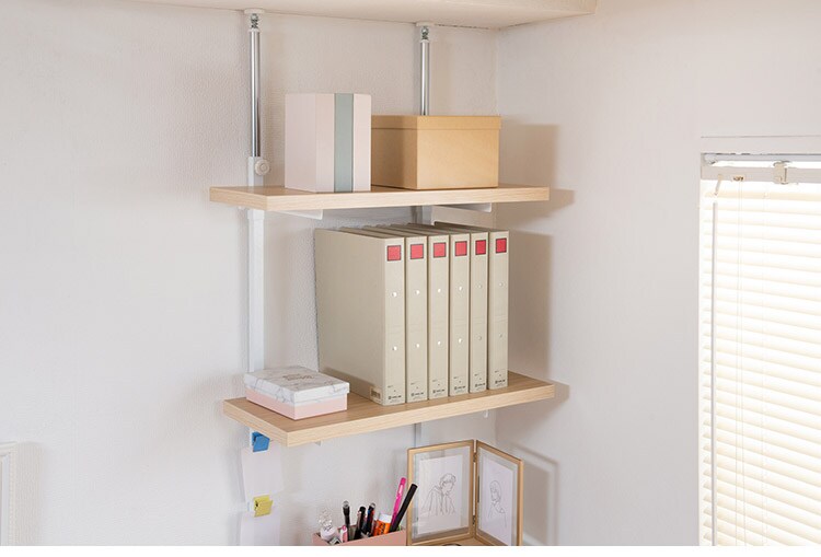 無段階に棚板の位置を調節できる突っ張りウォールシェルフ。棚板の位置を無段階に調節できるから自分の丁度いい高さにすることができます。
