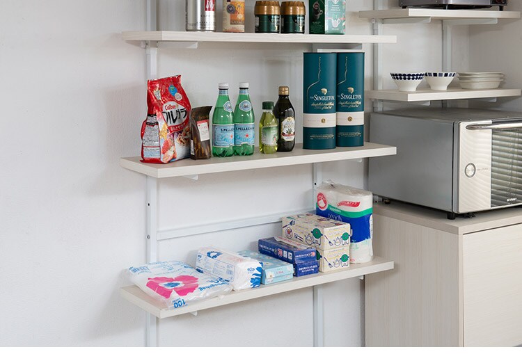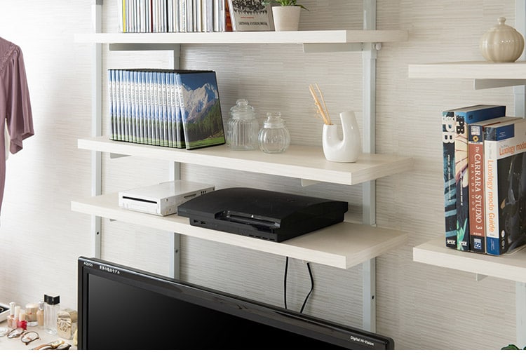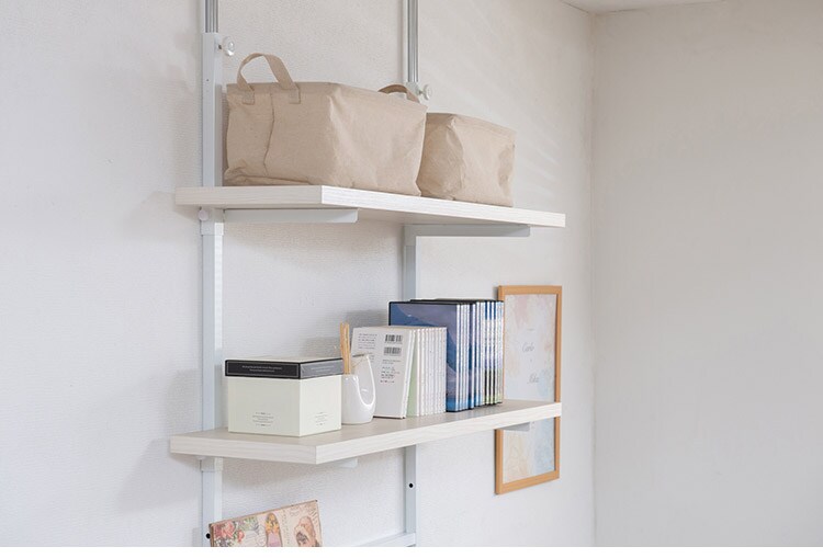 無段階に棚板の位置を調節できる突っ張りウォールシェルフ。棚板の位置を無段階に調節できるから自分の丁度いい高さにすることができます。
