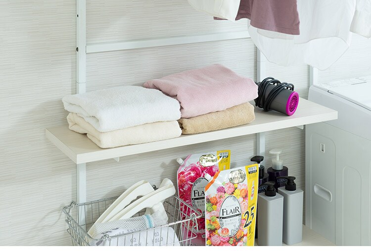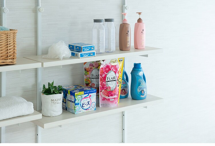 突っ張り壁面収納 無段階調整2枚棚オープンラック 幅89.5cm ホワイトウォッシュ 棚 つっぱり 薄型 収納 ディスプレイラック 店舗 新生活 カフェ サロン 一人暮らし diy 北欧 ランドリー【送料無料】のレビュー