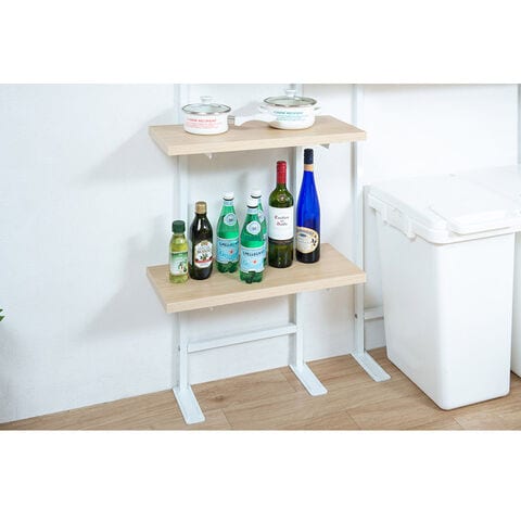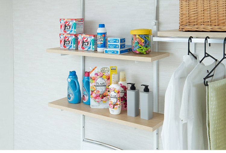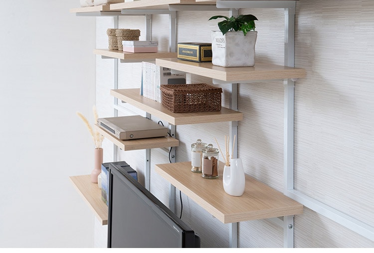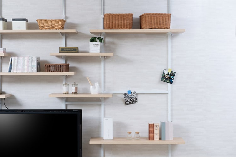 無段階に棚板の位置を調節できる突っ張りウォールシェルフ。棚板の位置を無段階に調節できるから自分の丁度いい高さにすることができます。
