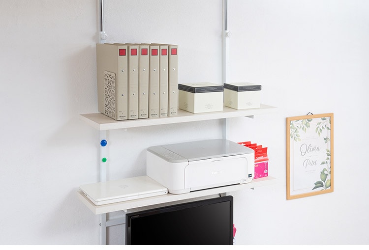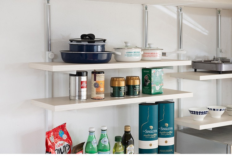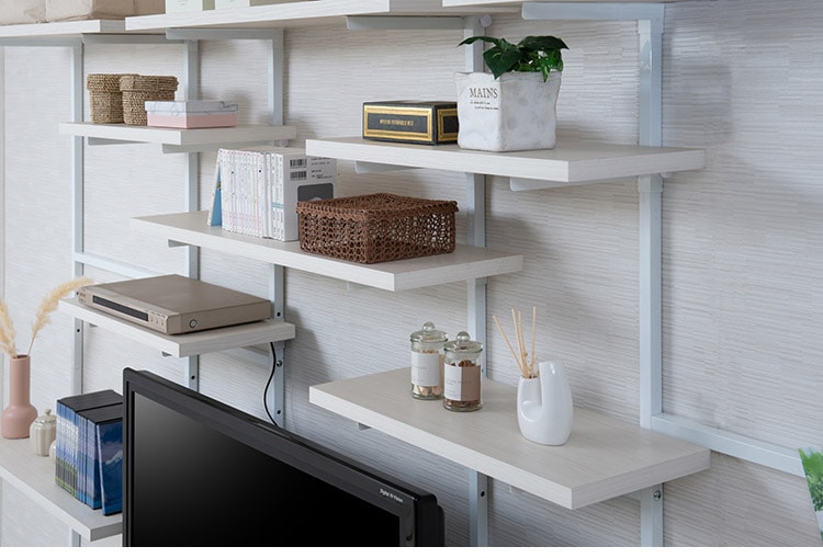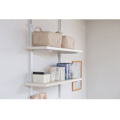無段階に棚板の位置を調節できる突っ張りウォールシェルフ。棚板の位置を無段階に調節できるから自分の丁度いい高さにすることができます。