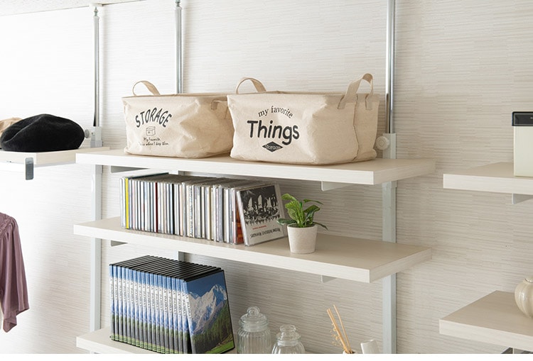 キッチンで食器や保存食を、リビングで雑誌やDVDを、ランドリーではバスタオルのストックや洗剤を置いたり。オープンなのでお気に入りの物や植物をおしゃれに飾り、お友達に自慢したりと様々な使い方ができ、とても便利で優秀です。また置きたいものに合わせて高さを調節できるので、もう少し高ければなぁ…となることはなくなります!棚板を追加して壁面いっぱいにディスプレイしたりと使い方は無限大!オシャレアイテムで自宅をカフェ風に。
