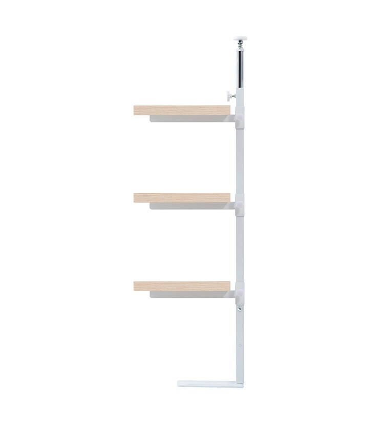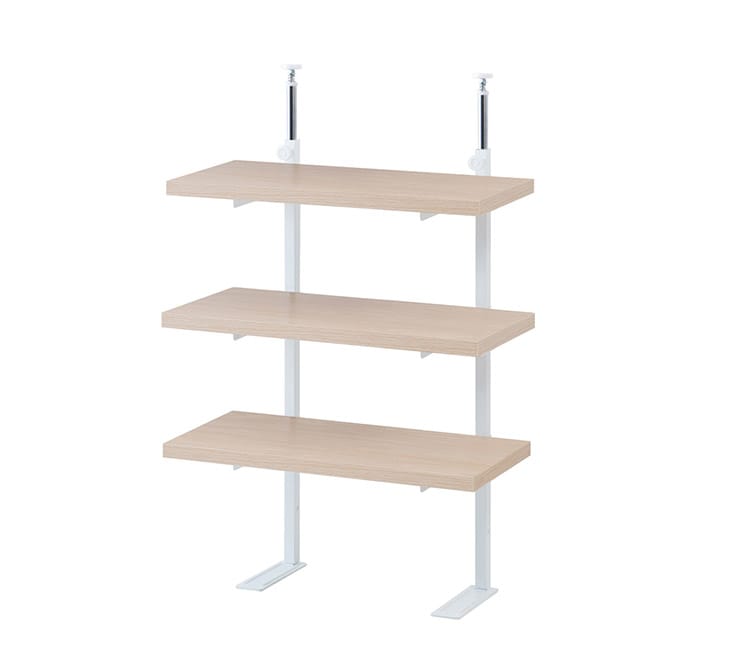 無段階に可変する棚板で、様々な物を、様々な用途で使う事ができる、万能型の突っ張り式のラックでお洒落なスペースに。棚板はつまみを緩めて移動が簡単にでき、無段階の高さ調節ができるので置くものに合わせてレイアウトができます。本体を2台並べて、別売り棚板を挟めば、用途がさらに広がります。置くものを変えても棚板を移動して模様替えが簡単にできるのが大変便利です。