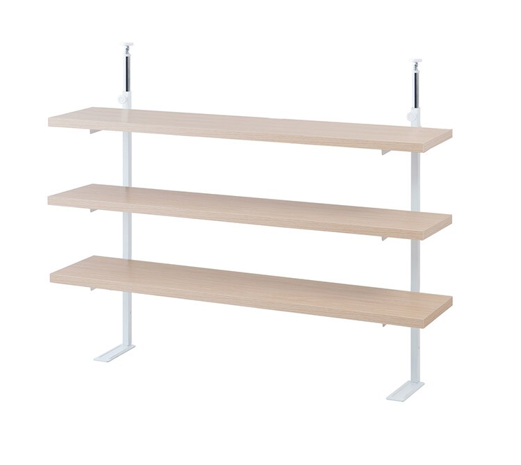 無段階に可変する棚板で、様々な物を、様々な用途で使う事ができる、万能型の突っ張り式のラックでお洒落なスペースに。棚板はつまみを緩めて移動が簡単にでき、無段階の高さ調節ができるので置くものに合わせてレイアウトができます。本体を2台並べて、別売り棚板を挟めば、用途がさらに広がります。置くものを変えても棚板を移動して模様替えが簡単にできるのが大変便利です。