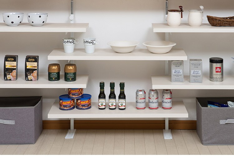 カウンター下のデッドスペースをオープンラックで収納スペースを作るウォールラック。突っ張り式の薄型省スペース設計で左右側板レスという圧迫感のないすっきり仕上げ。