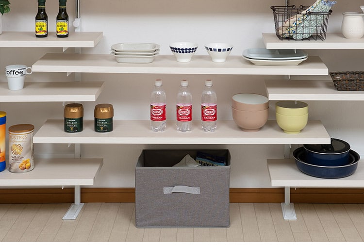 カウンター下のデッドスペースをオープンラックで収納スペースを作るウォールラック。突っ張り式の薄型省スペース設計で左右側板レスという圧迫感のないすっきり仕上げ。