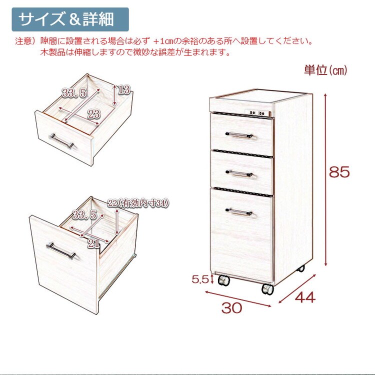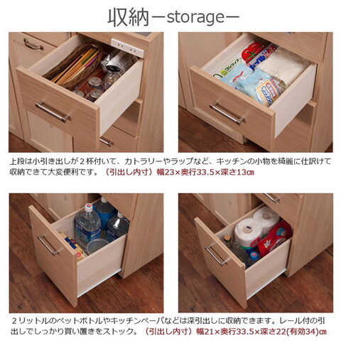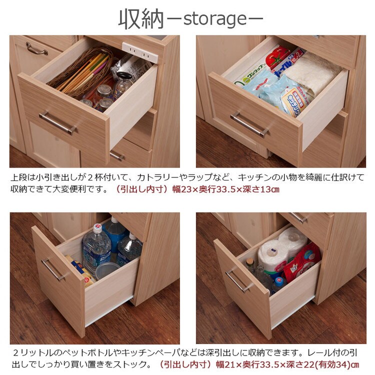 引出し内寸(共通):(約)幅(浅)23(深)21×奥行33.5×深さ(浅)13(深)22(有効34)cm