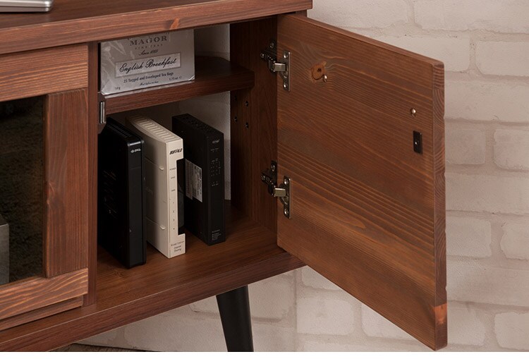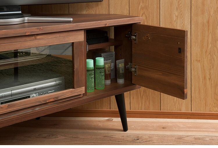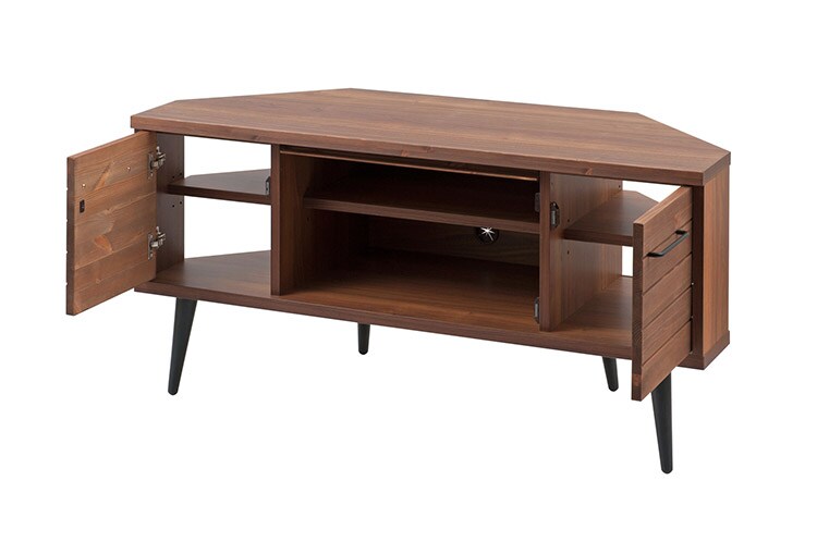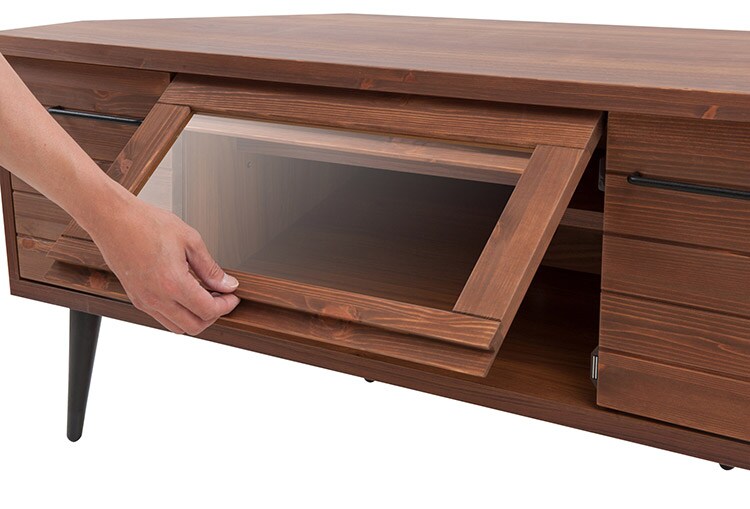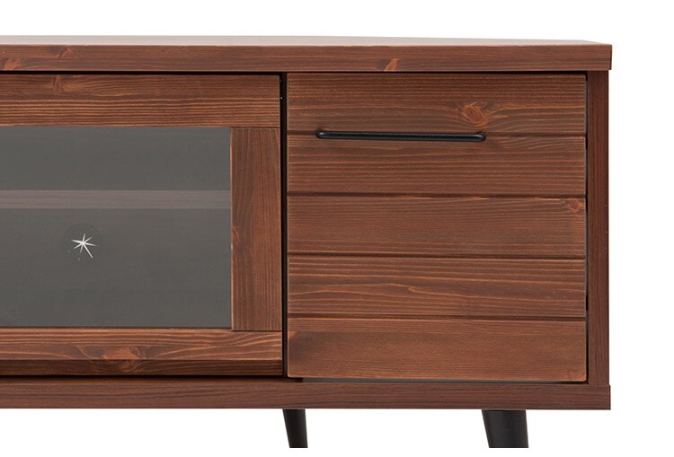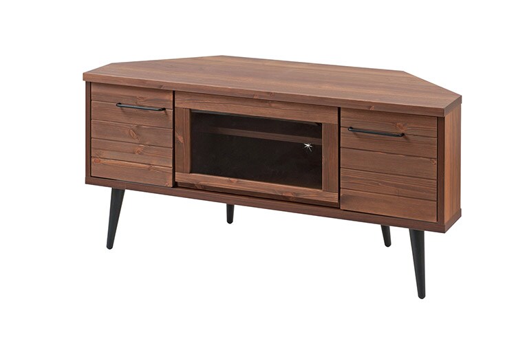 ヴィンテージな風合いのコーナーテレビボード『Mr.skinny』。前板に雰囲気あるパイン材を使用し、味のある塗装に仕上げたボードに妖艶なスキニーレッグを取り付けた唯一無二の存在。ガラス付きフラップ扉でリモコン操作可能。収納付きテレビ台でどこからでも見やすいコーナー仕様。アイアン取っ手が重厚で天然木の風合いとマッチ。