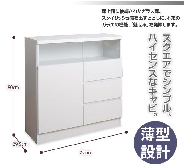 | 扉にガラスが一体化したスタイリッシュキャビネット。 ガラス内にはお気に入りのグラスや写真等をディスプレイすれば、自分空間のできあがり。扉内には可動棚1枚付きです。 同商品を2つ3つ並べればガラスが一通に並んで綺麗。 余計なものを排除したシンプルモダンな印象。 |
