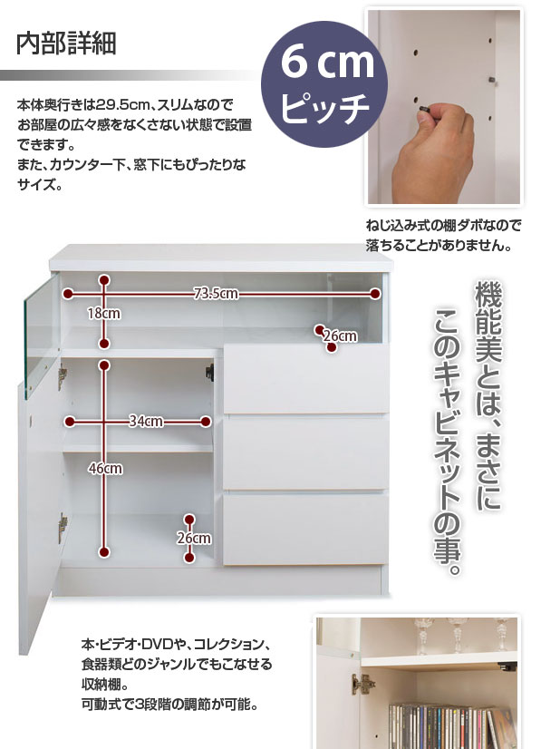 | 材質/前・天板:強化プリント紙化粧繊維板 その他:プリント紙化粧繊維板 可動棚1枚・6cmピッチ 耐荷重量/天板:約15kg、棚板:約10kg 商品重量:約18kg 日本製 |