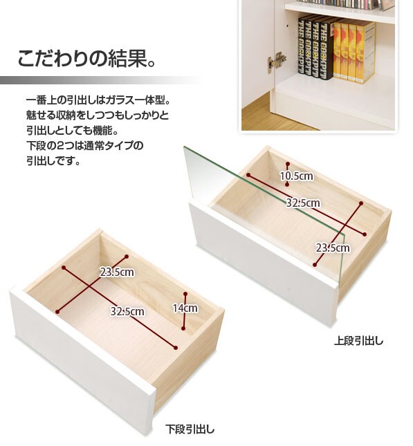 | サイズ:(約)幅79×奥行29.5×高さ80cm ガラス部内寸:(約)幅73.5×奥行26×高さ18cm 扉内内寸:(約)幅34×奥行26×高さ46cm 引出し内寸:(約)幅32.5×奥行23.5×深さ(浅)10.5(深)14cm |