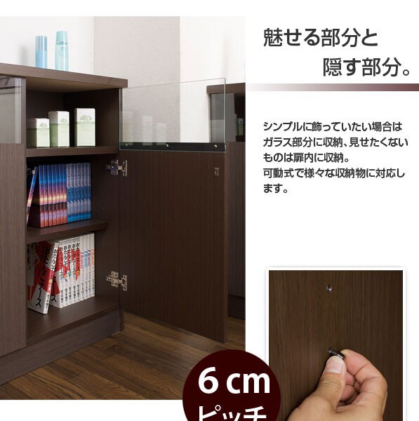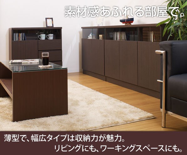 | 材質/前・天板:強化プリント紙化粧繊維板 その他:プリント紙化粧繊維板 可動棚<大・小>各1枚・6cmピッチ 耐荷重量/天板:約15kg、棚板:約10kg 商品重量:約28kg 日本製 |