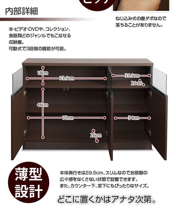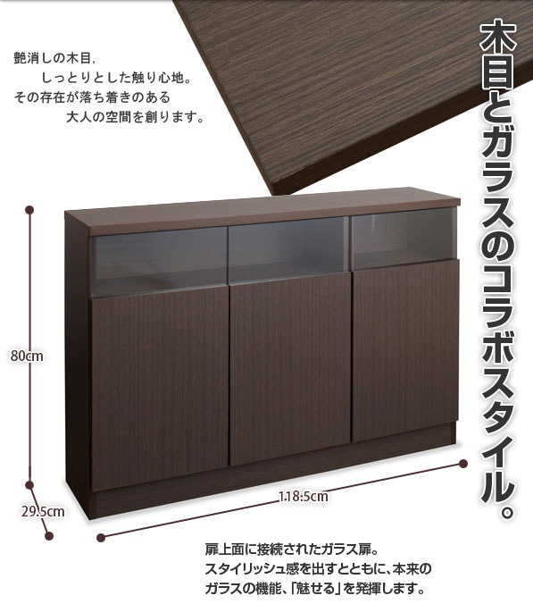 | サイズ:(約)幅118.5×奥行29.5×高さ80cm ガラス部内寸:(約)幅(右)35.5(左)73.5×奥行26×高さ18cm 扉内内寸:(約)幅(右)34(左)72×奥行26×高さ46cm |
