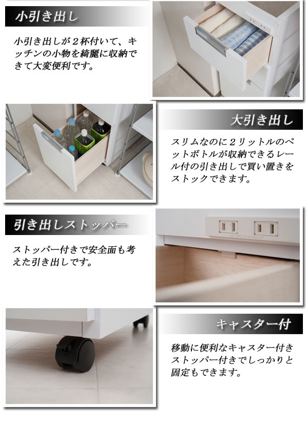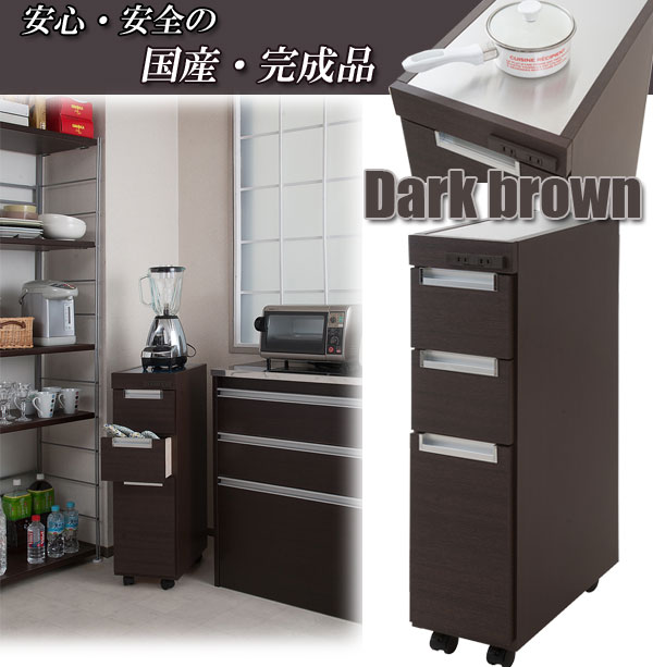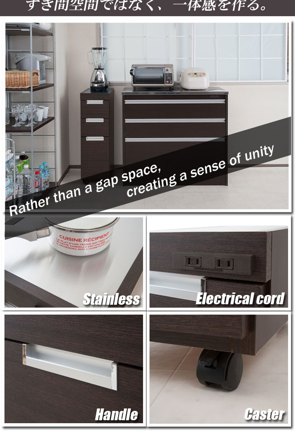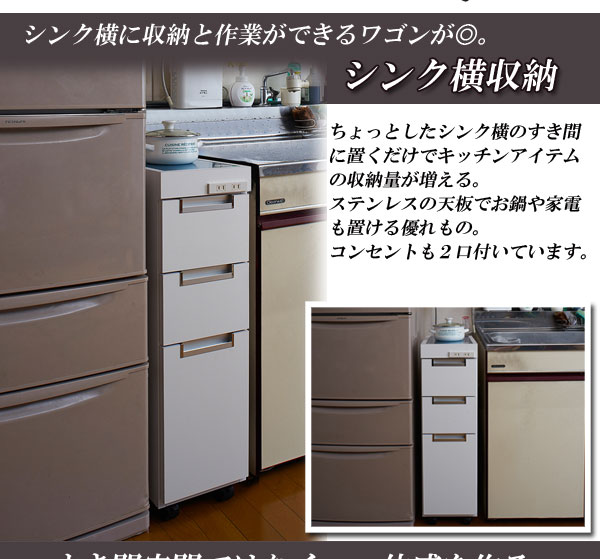 | ちょっとしたシンク横のすき間に置くだけでキッチンアイテムの収納量が増えるスリムワゴン。ステンレス天板でお鍋や家電も置ける優れもの。便利なコンセント2口付き。スリムなのに2リットルのペットボトルが収納できるレール付の深引出しで買い置きをストックできます。移動に便利なキャスターはストッパー付きでしっかりと固定もできます。システムキッチンと一体感が出るようフラットデザインにしました。キッチンだけでなく、サニタリーなどデッドスペースにぴったりな幅3サイズをご用意。 |