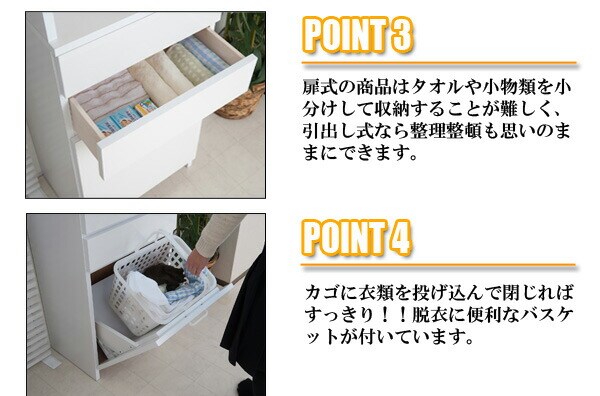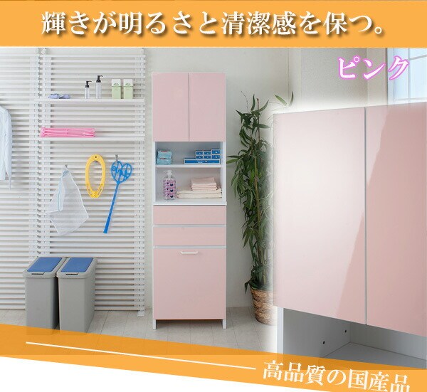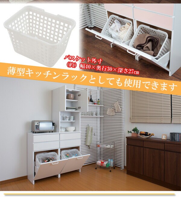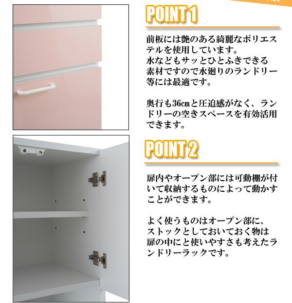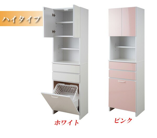 | 前板には艶のある綺麗なポリエステルを使用しています。水などもサッとひとふきできる素材ですので水廻りのランドリー等には最適です。奥行も36cmと圧迫感がなく、ランドリーの空きスペースを有効活用できます。カゴに衣類を投げ込んで閉じればすっきり!!脱衣に便利なバスケットが付いています。またキッチン収納でバスケットをゴミ箱使いとしてもGOOD!薄型を活かしたシーンを選ばず設置できます。ロータイプとハイタイプに清潔感たっぷりのホワイト色とキレイなカラーのピンク色の展開。 |