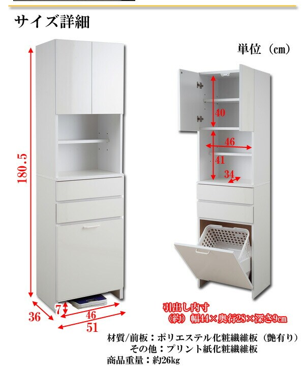 | 材質/天板・前板:ポリエステル化粧繊維板、その他:プリント紙化粧繊維板、バスケット:ポリプロピレン 商品重量:26kg 日本製 |