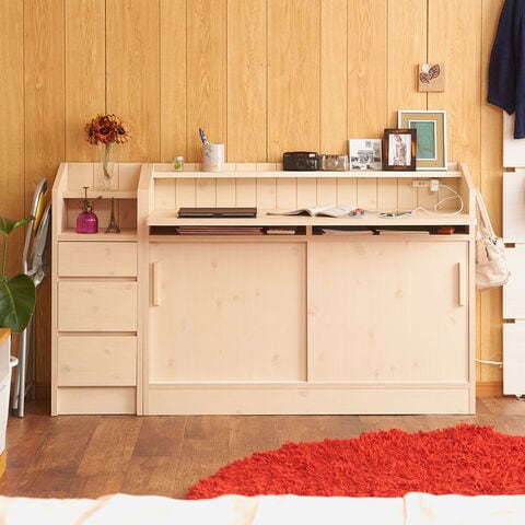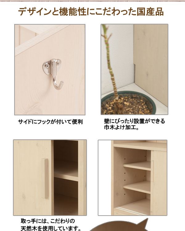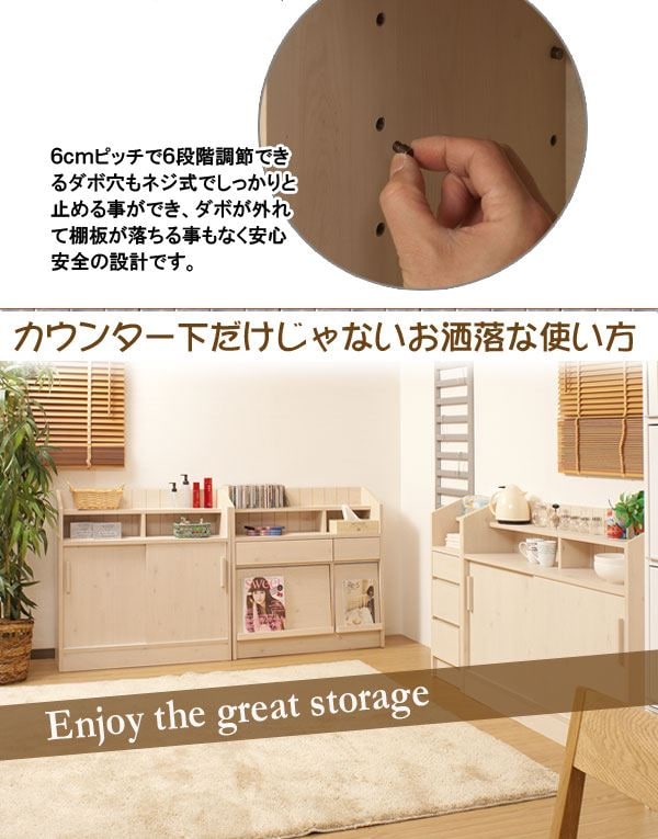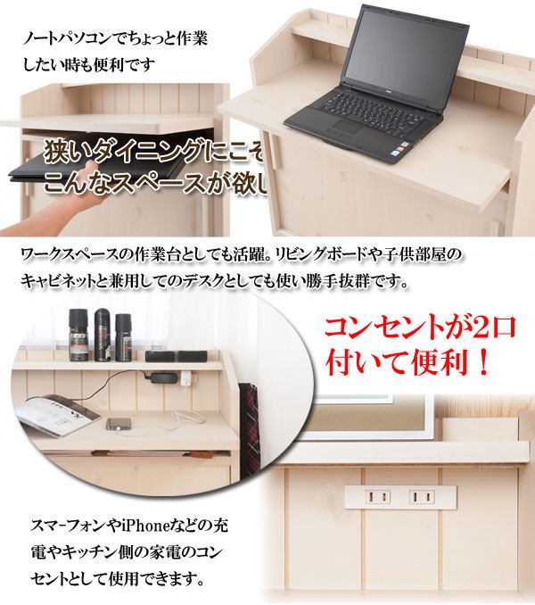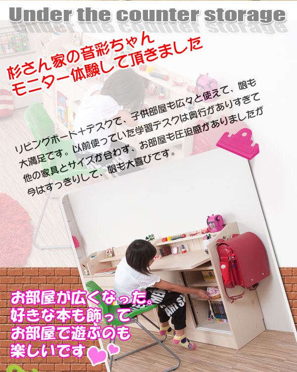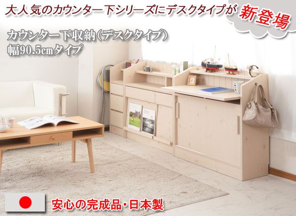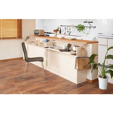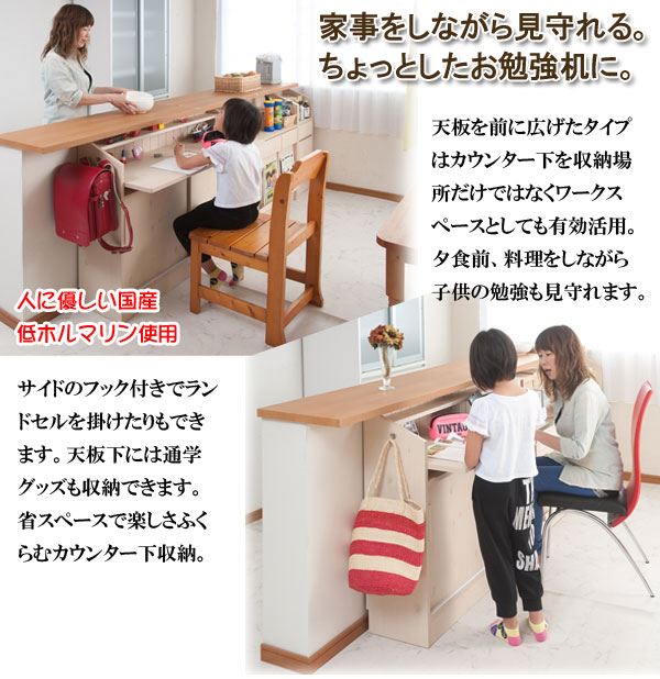 ■商品について/ 大人気のカウンター下シリーズにデスクタイプが新登場!いつもはダイニングテーブルで宿題をしていたお子様も、これならキッチンからお子様の状況確認もでき、安心して料理の支度がすすむ~!会話も弾み、子供との時間、家族との時間を育めます。奥にはコンセントも完備し、スマホやタブレットの充電に最適!ちょっとしたネットサーフィンや料理の献立などノートパソコンを使うのに丁度良いサイズ。天板のみ出ているので圧迫感無くお部屋に溶け込みます。棚板は6cmピッチ・6段階調節で、ネジ穴式ダボを採用でダボが抜け落ちて棚板が落ちる心配無用!天板下すきまにはノートパソコンやタブレットを収納しておくのに便利。サイドには左右どちらかにセットできるフックが付属し、ランドセルやお稽古カバンなど毎日の必要バッグなどかけておくのに最適。同シリーズと組み合わせて快適な空間を。