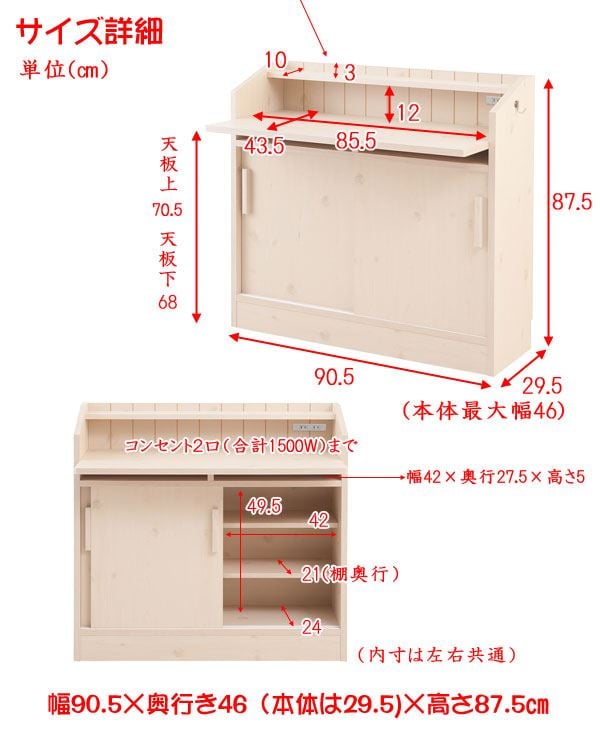 ■商品サイズ/本体:(約)幅118.5×奥行29.5(天板含む46)×高さ87.5cm、扉部内寸:(約)幅(左右)56×奥行24(棚板奥行21)×高さ49.5cm、天板:(約)幅114×奥行43.5cm、地面~天板上:(約)70.5cm、地面~天板下:(約)68cm
