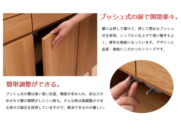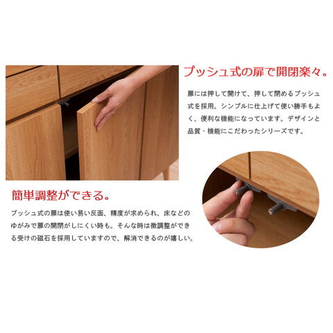 扉付きキャビネットはリビングボードとしてリビングのあらゆるものをしまっておくのに大活躍。取っ手のないプッシュ式扉がすっきりとデザイン性もアップ。掃除も楽な高めの脚付きで、おしゃれ。