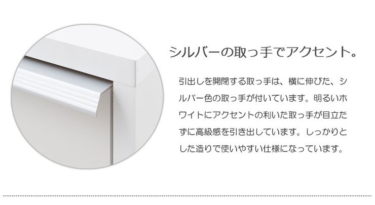 ■商品について/シンプルに仕上げたスタイリッシュシリーズ。細かく分かれた5杯の引出しが色んな小物を小分けして整理ができます。幅も約30cmとスリムでちょっとしたデッドスペースに置けます。他のシリーズと合わせて、キッチンやリビングなどでお洒落に収納できます。引出しを開閉する取っ手は、横に伸びた、シルバー色取っ手が付いています。明るいホワイトにアクセントの利いた取っ手が目立たずに高級感を引き出しています。しっかりとした造りで使いやすい仕様になっています。