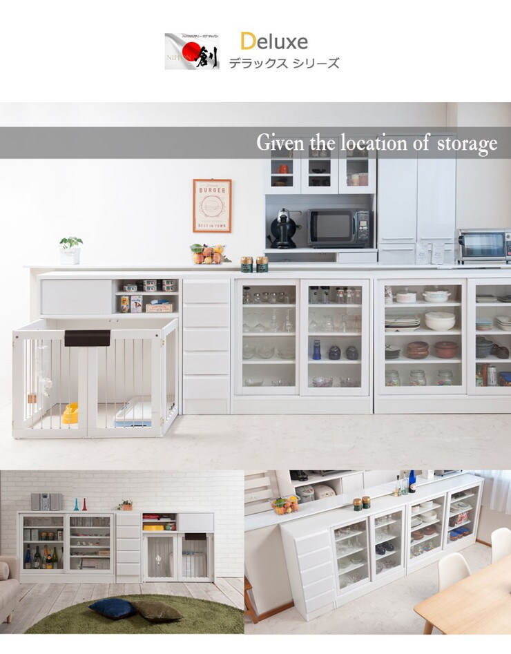 ■商品について/圧迫感がなく、シンプルデザインに仕上げたDELUXシリーズ。桐の木目とデザインが優しい雰囲気を醸しだす、職人が組み上げた、日本製の完成品のカウンター下収納。引き戸式のカウンター下収納は、滑車付きで動きもスムーズ。引き戸式ならわずかなスペースで開閉が可能。取り出し易い引き戸式でキッチンスペースが使い易くなります。リビング・ダイニングを効率よく使えて、綺麗に収納。CDやDVD、コミックなども綺麗に収納ができます。他のシリーズと合わせて、キッチンやリビングなどでお洒落に収納できます。
