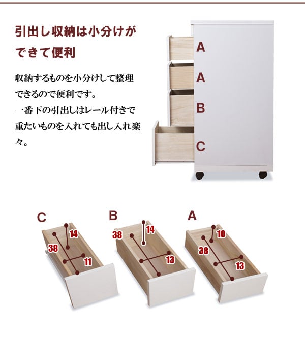 | 本体:(約)幅20.5×奥行55×高さ85(キャスター含む)cm 引き出し(上2段):(約)幅13×奥行38×高さ10cm 引き出し(3段目):(約)幅13×奥行38×高さ14cm 引き出し(下段):(約)幅11×奥行38×高さ14cm |