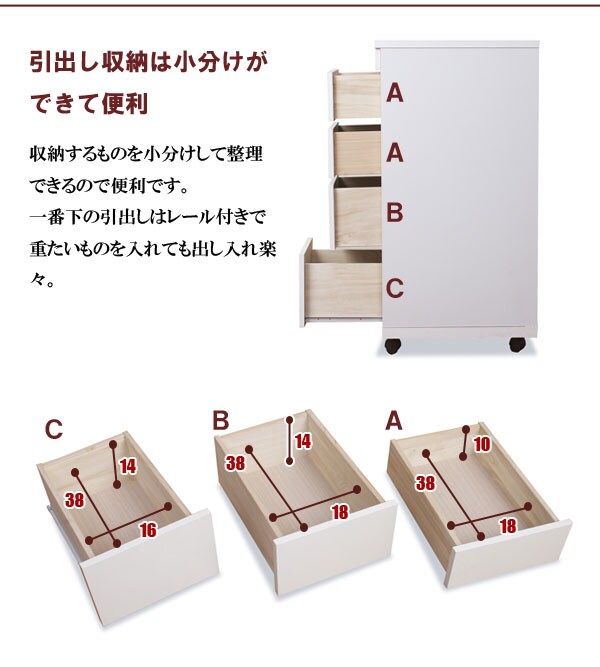| 本体:(約)幅25.5×奥行55×高さ85(キャスター含む)cm 引き出し(上2段):(約)幅18×奥行38×高さ10cm 引き出し(3段目):(約)幅18×奥行38×高さ14cm 引き出し(下段):(約)幅16×奥行38×高さ14cm |