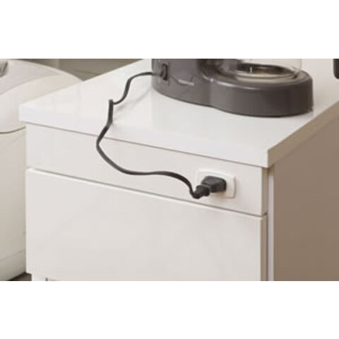 | わずかなすき間がキッチンの収納&作業スペースに! 前面と天板はツヤがあり、水や汚れに強い材質を使用しています。 前面にコンセント付き。 引き出しの奥行きが深いので、収納量大です。 |