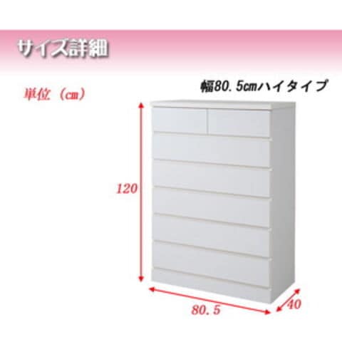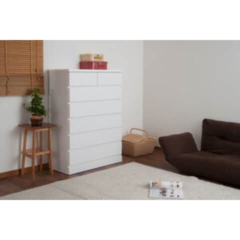 洋室や和室から子供部屋まで、どんなシーンにも溶け込むホワイトのチェスト。収納力抜群のチェストは幅80.5cmのハイタイプと幅119.5cmのロータイプの2タイプをご用意。大引出しはレール付で出し入れが楽々。使い易いチェストが◎箪笥の反りや歪みをおさえて、いつまでも長くお使い頂けるように全段に地板を入れて頑丈なつくりにしています。安価な物には地板が入っていないこともあるのでここもチェック。安価な物にはレールがなく、使っているうちに開閉しづらくなってきた事ってありませんか?当店は安価でもそんな悩みを解消!大引出し全てにレールを付けて長くご愛用頂ける様にと商品を開発しました。
