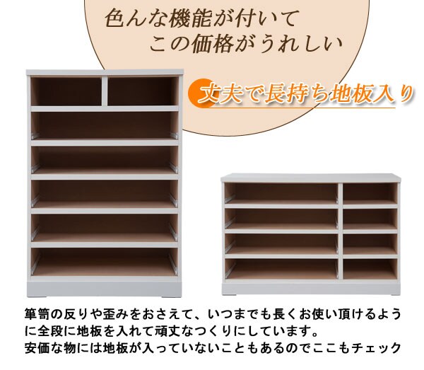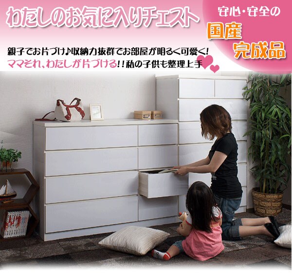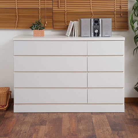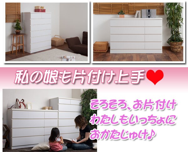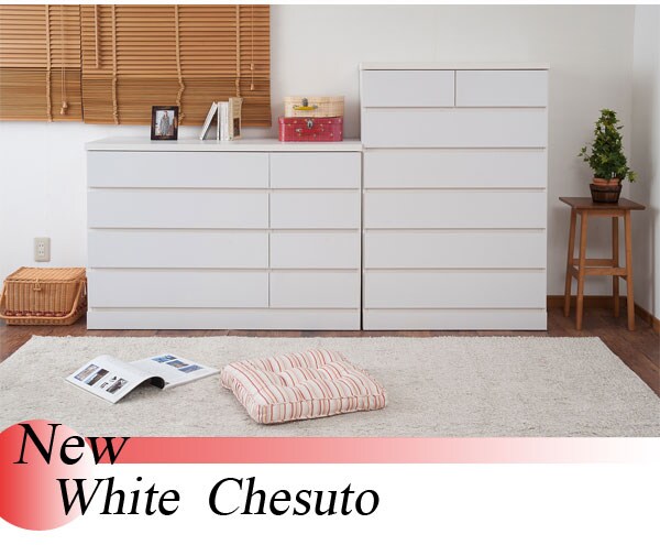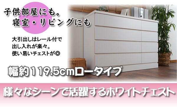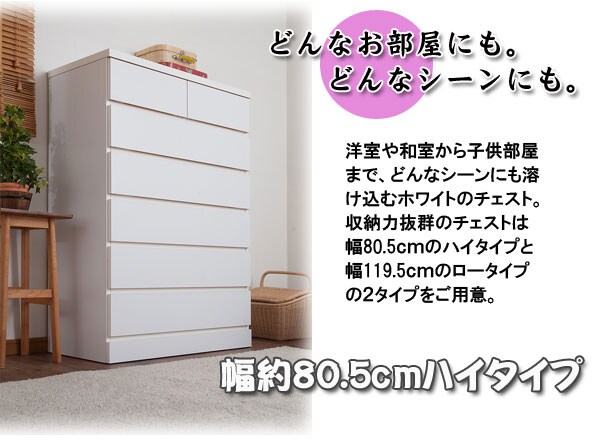 | 洋室や和室から子供部屋まで、どんなシーンにも溶け込むホワイトのチェスト。収納力抜群のチェストは幅80.5cmのハイタイプと幅119.5cmのロータイプの2タイプをご用意。大引出しはレール付で出し入れが楽々。使い易いチェストが◎箪笥の反りや歪みをおさえて、いつまでも長くお使い頂けるように全段に地板を入れて頑丈なつくりにしています。安価な物には地板が入っていないこともあるのでここもチェック。安価な物にはレールがなく、使っているうちに開閉しづらくなってきた事ってありませんか?当店は安価でもそんな悩みを解消!大引出し全てにレールを付けて長くご愛用頂ける様にと商品を開発しました。 |