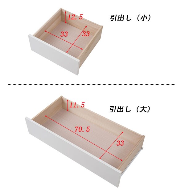 | 本体:(約)幅119.5×奥行40×高さ84cm 引出し内寸:小/(約)幅33×奥行き33×深さ12.5 大/(約)幅70.5×奥行き33×深さ11.5 |