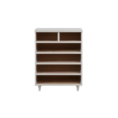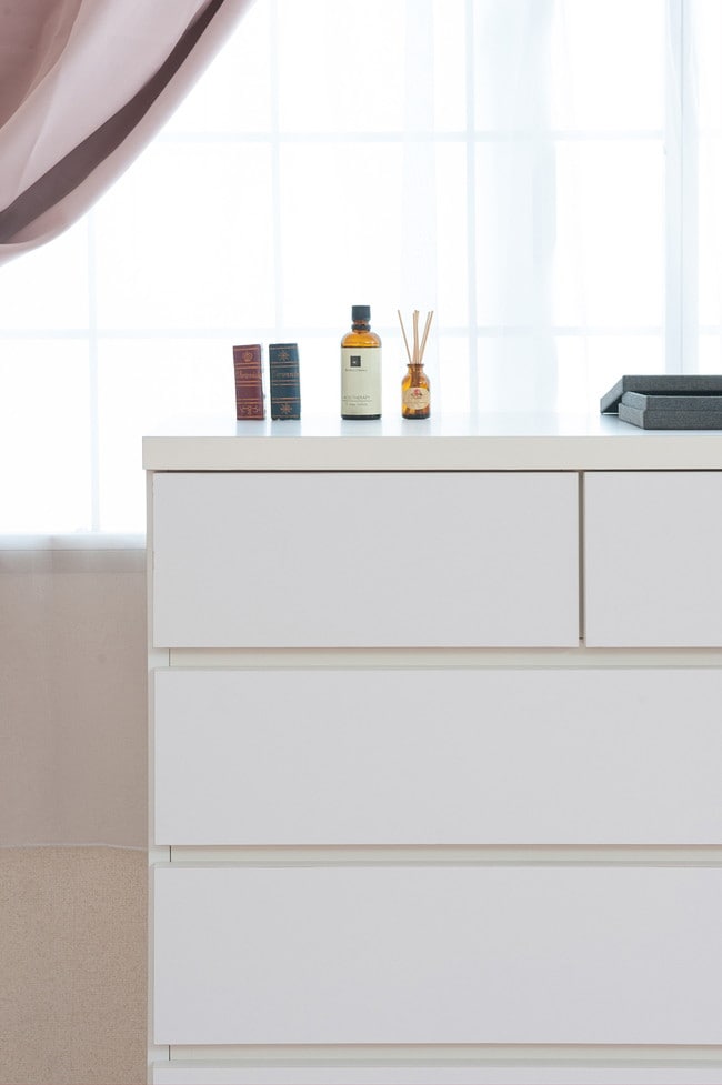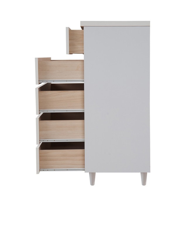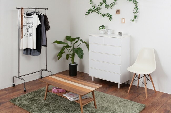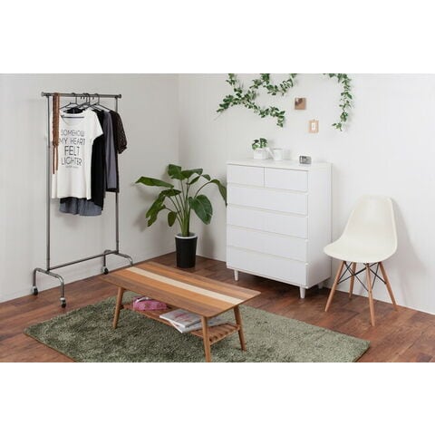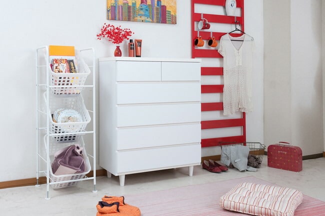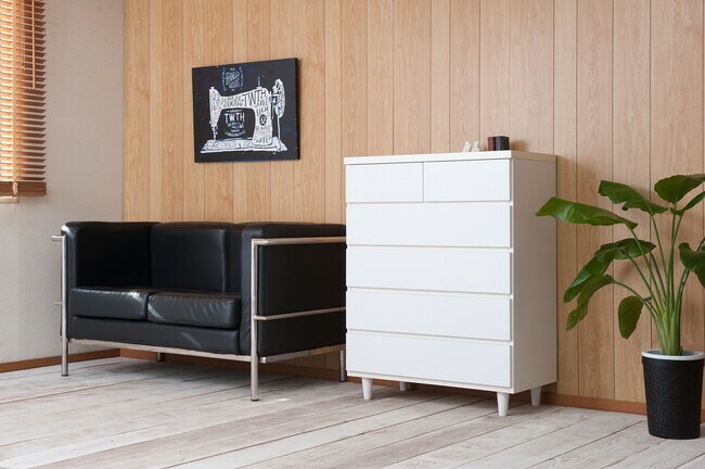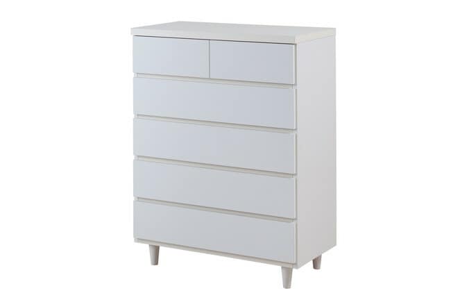 直線的なデザインに円錐型の木製脚がマッチしたホワイトチェスト。収納力とデザイン性のバランスを考えた有能チェスト。モダンシーンから可愛い系まで男女問わず様々な場面で活躍します。引出しの間には全段地板入りで強度も◎。大引出しはスライドレール付きでスムーズに開閉します。スタイリッシュに仕上がったチェストは脚の丸みがこだわり。真っ白のチェストは圧迫感なくそれでいて存在感あり、白好きにはたまらないオールホワイト色で仕上げました。