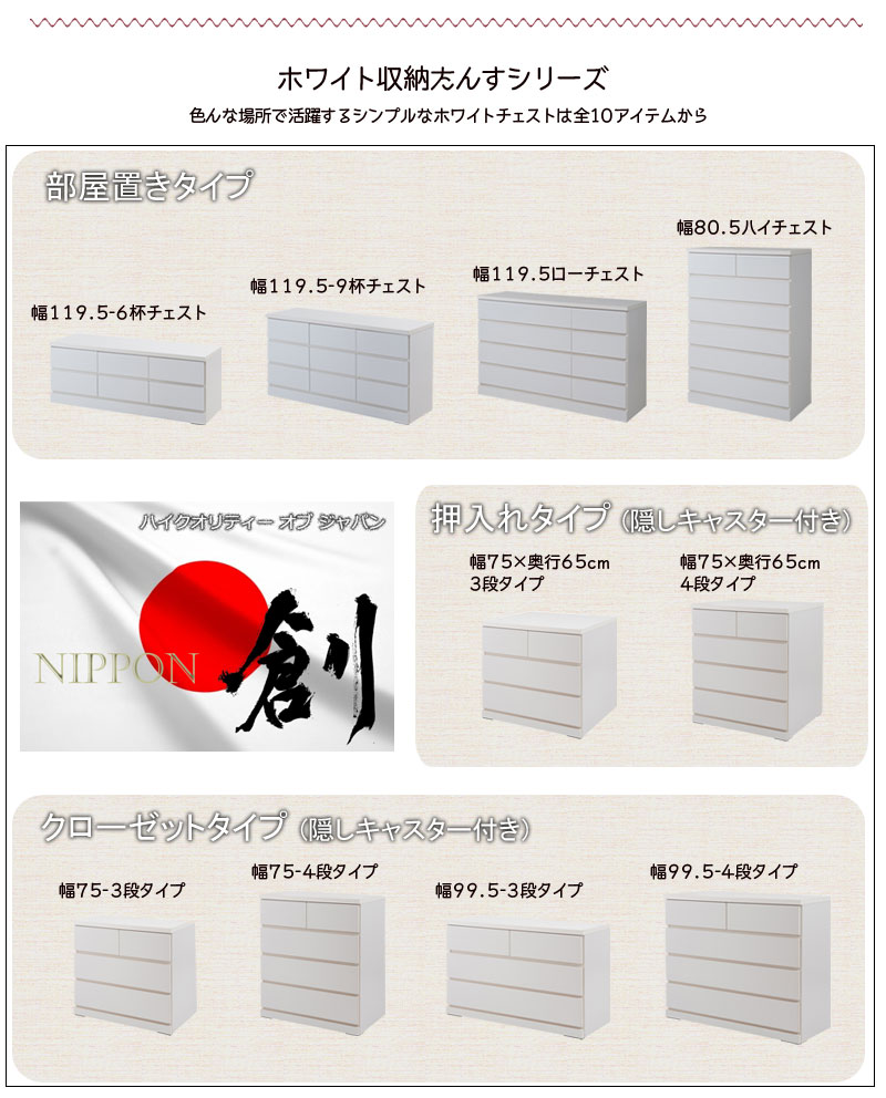 日本製 完成品 押入れ たんす 幅75cm 奥行65cm 4段 ホワイト 白 国産 チェスト ローチェスト 収納 おしゃれ 高さ80 引き出し 北欧【送料無料】