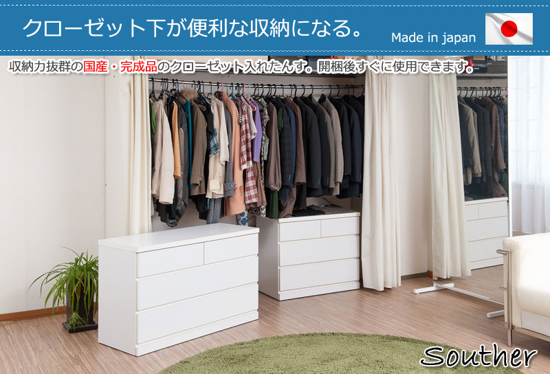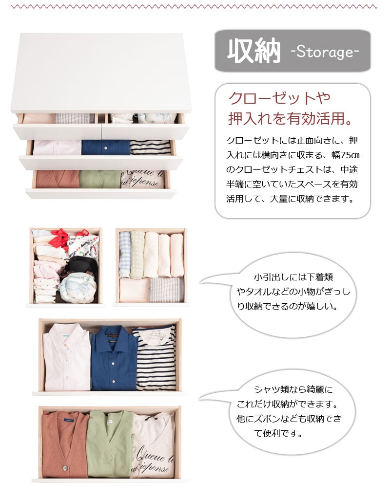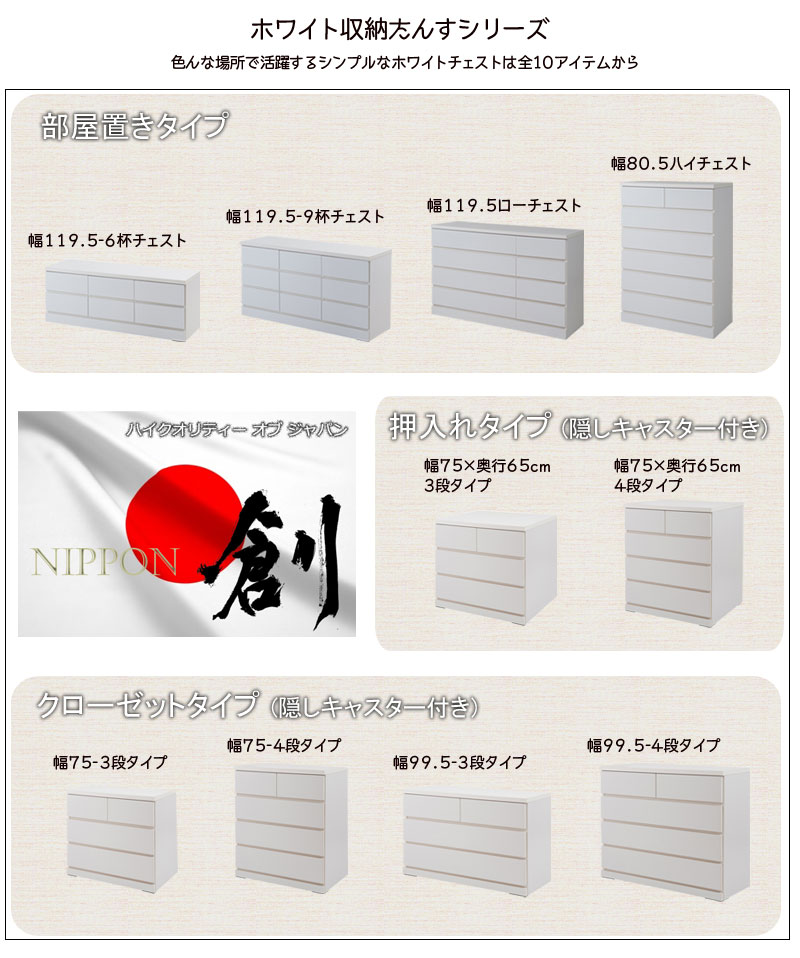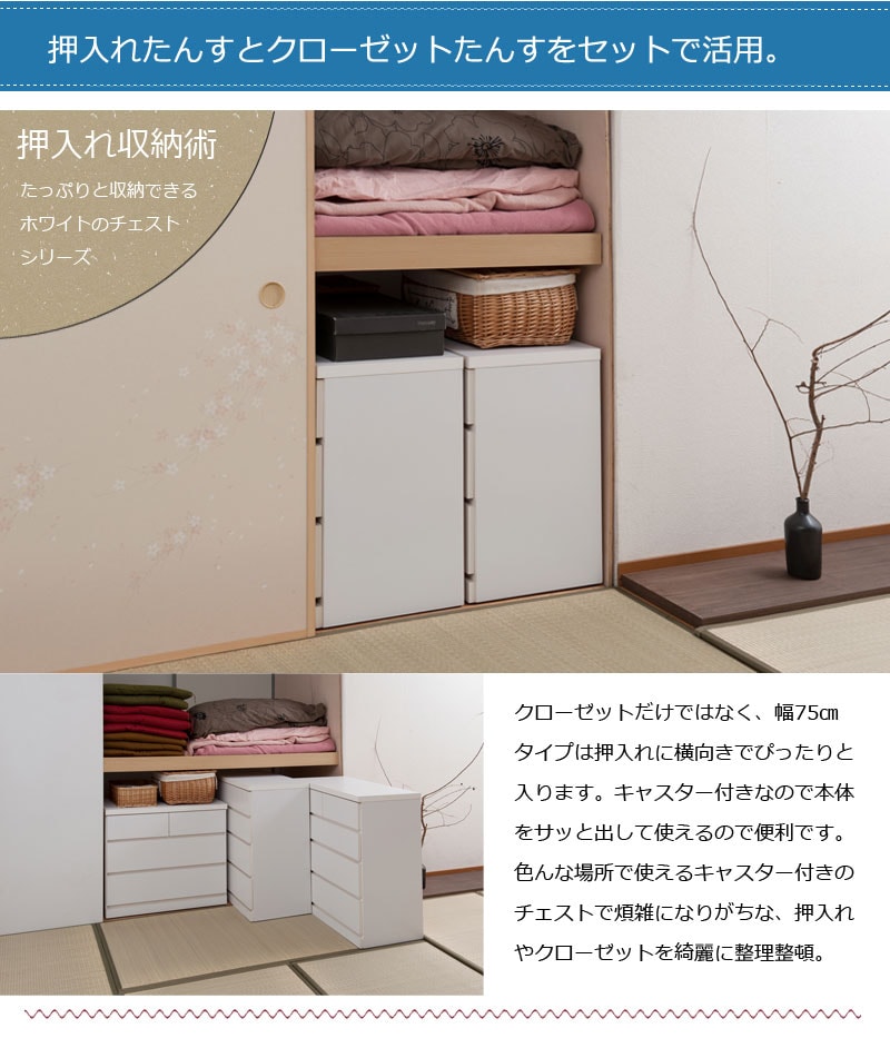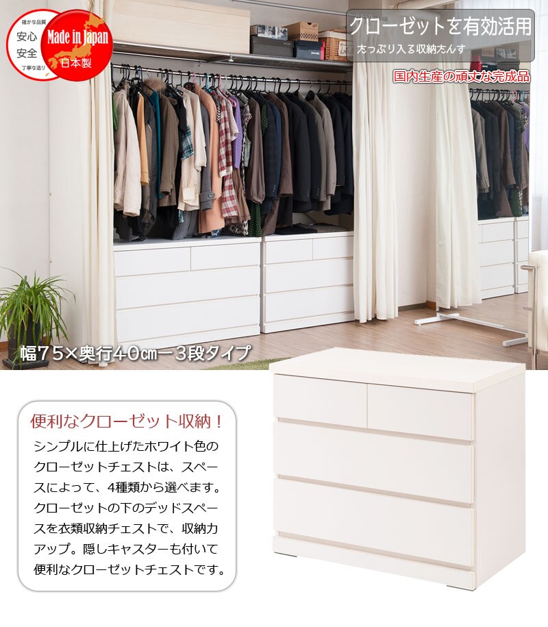 クローゼットチェスト 幅75cm 3段 ホワイト 国産 完成品チェスト クローゼットチェスト 幅75 3段 ローチェスト タンス たんす【送料無料】