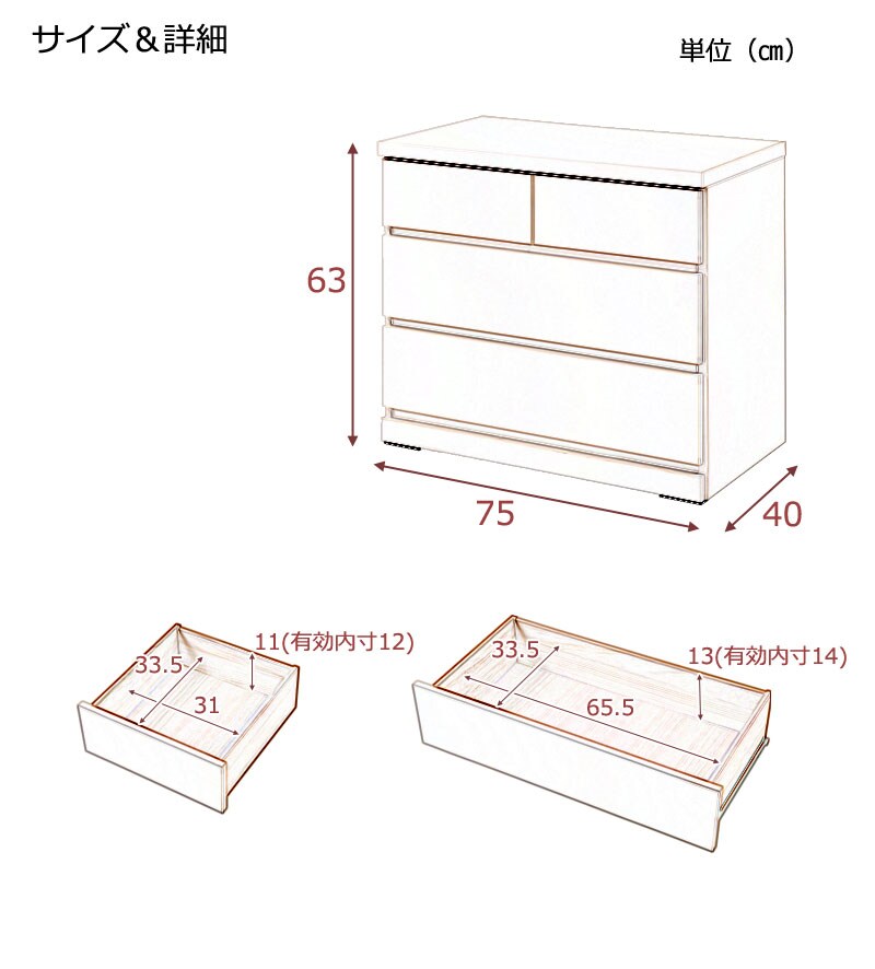 ■引出し内寸/(約)幅31×奥行33.5×深さ11(有効内寸12)cm、(約)幅65.5×奥行33.5×深さ13(有効内寸14)cm